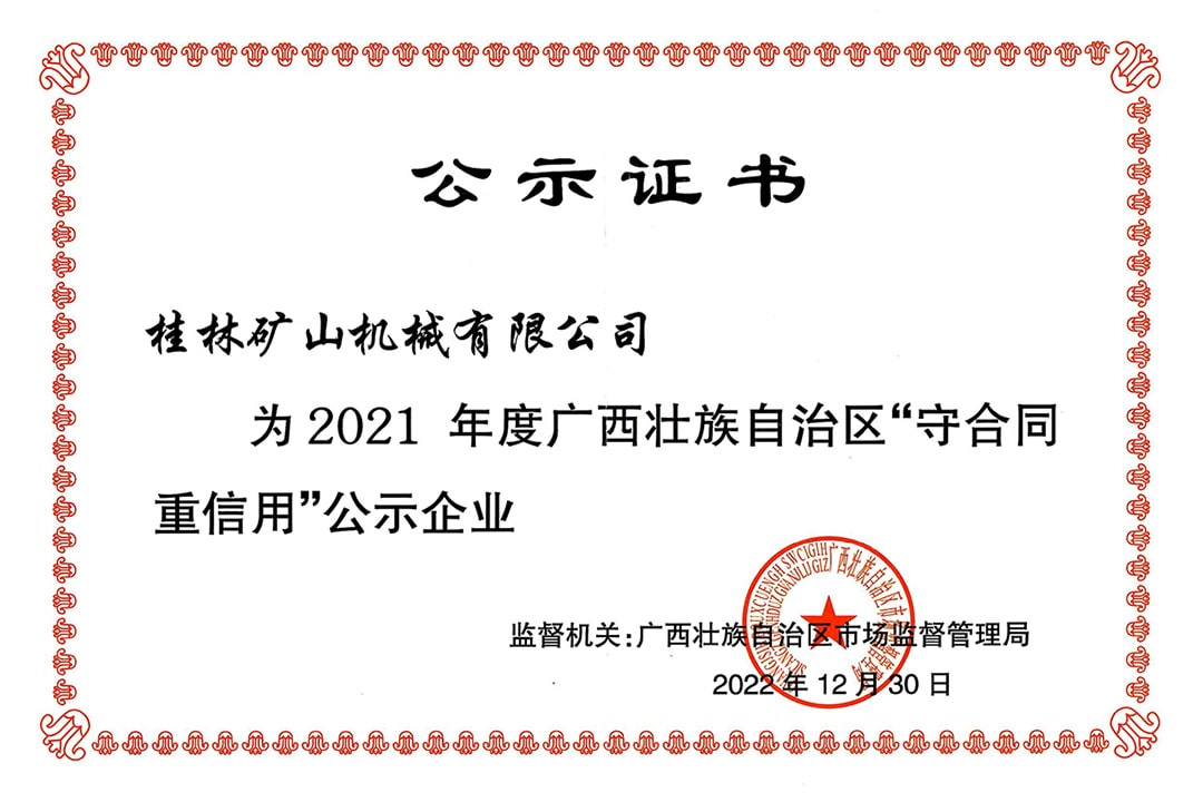 2022年末,自治區市場監督管理局發布了《關于公示廣西2021年度“守合同 重信用”企業名單的通告》,桂林礦機憑借誠信的經營理念和良好的市場信譽等優勢,再獲“守合同 重信用”企業榮譽稱號。這份殊榮不僅是桂林礦機持續耕耘“以信為本”的努力付出的結果,更是桂林礦機“技術升級、研發升級、工藝升級、文化升級”的錘煉升級。